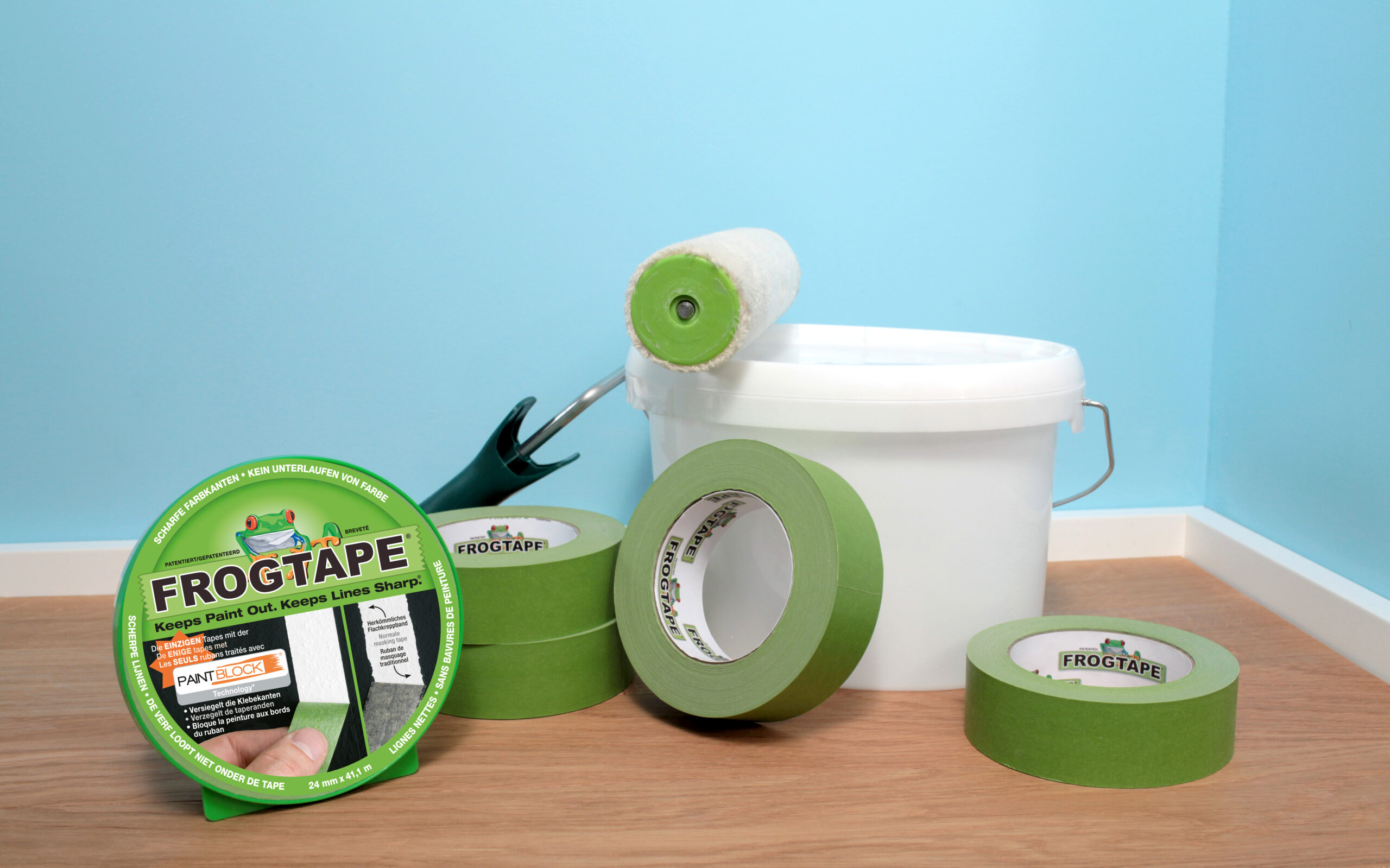 All FrogTape® brand painter’s tapes are treated with patented PaintBlock® Technology, a super-absorbent polymer that reacts with the water in latex paint and instantly gels to form a micro-barrier that seals the edges of the tape, preventing paint bleed and the need for touch-ups.
